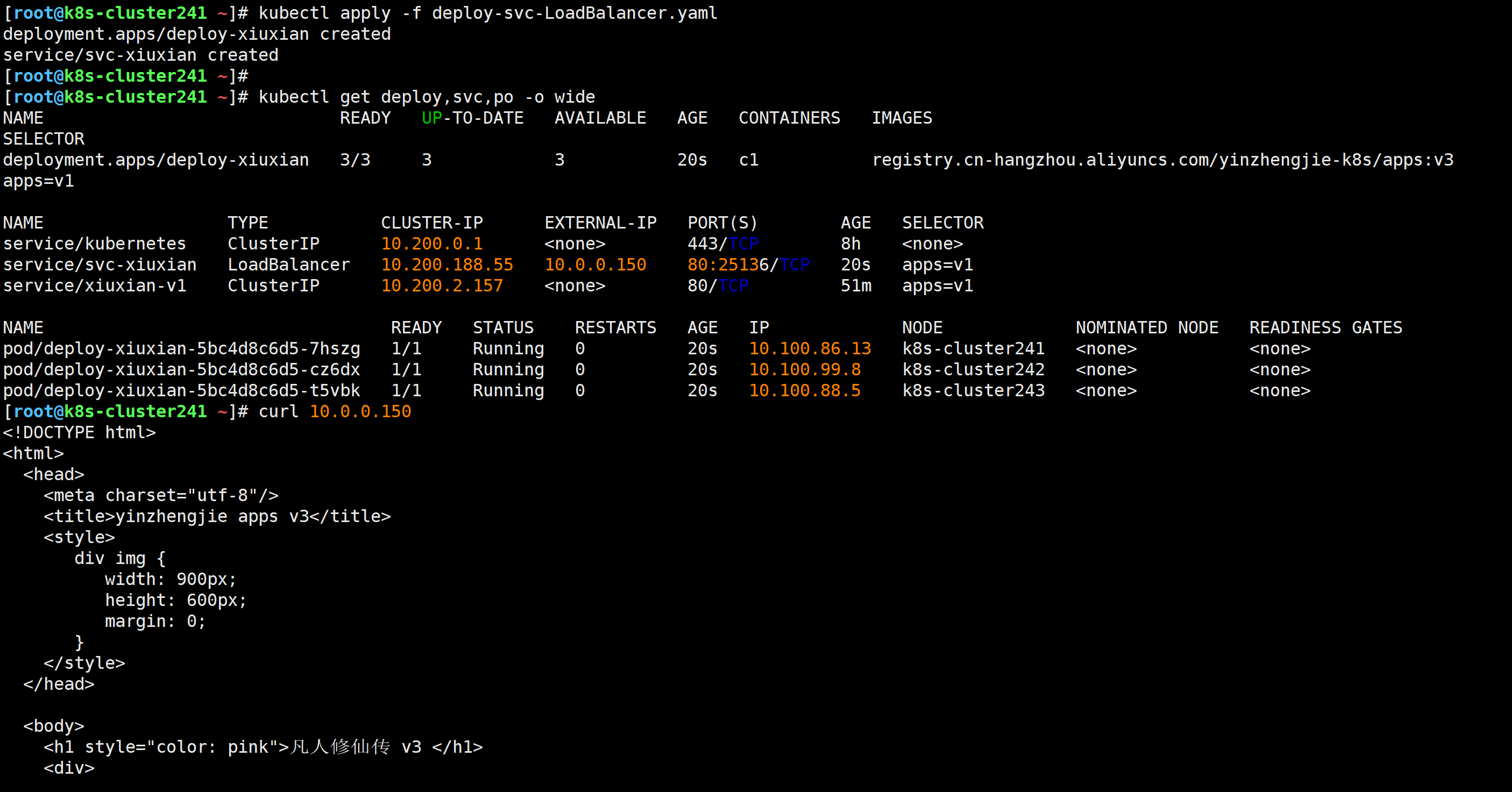 [root@k8s-cluster241 ~]# kubectl apply -f deploy-svc-LoadBalancer.yaml