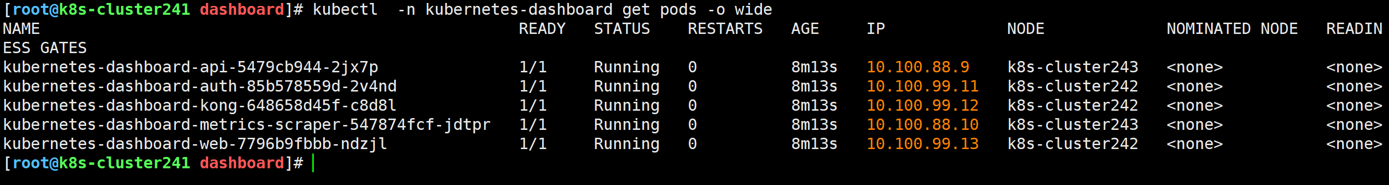[root@k8s-cluster241 dashboard]# kubectl -n kubernetes-dashboard get pods -o wide