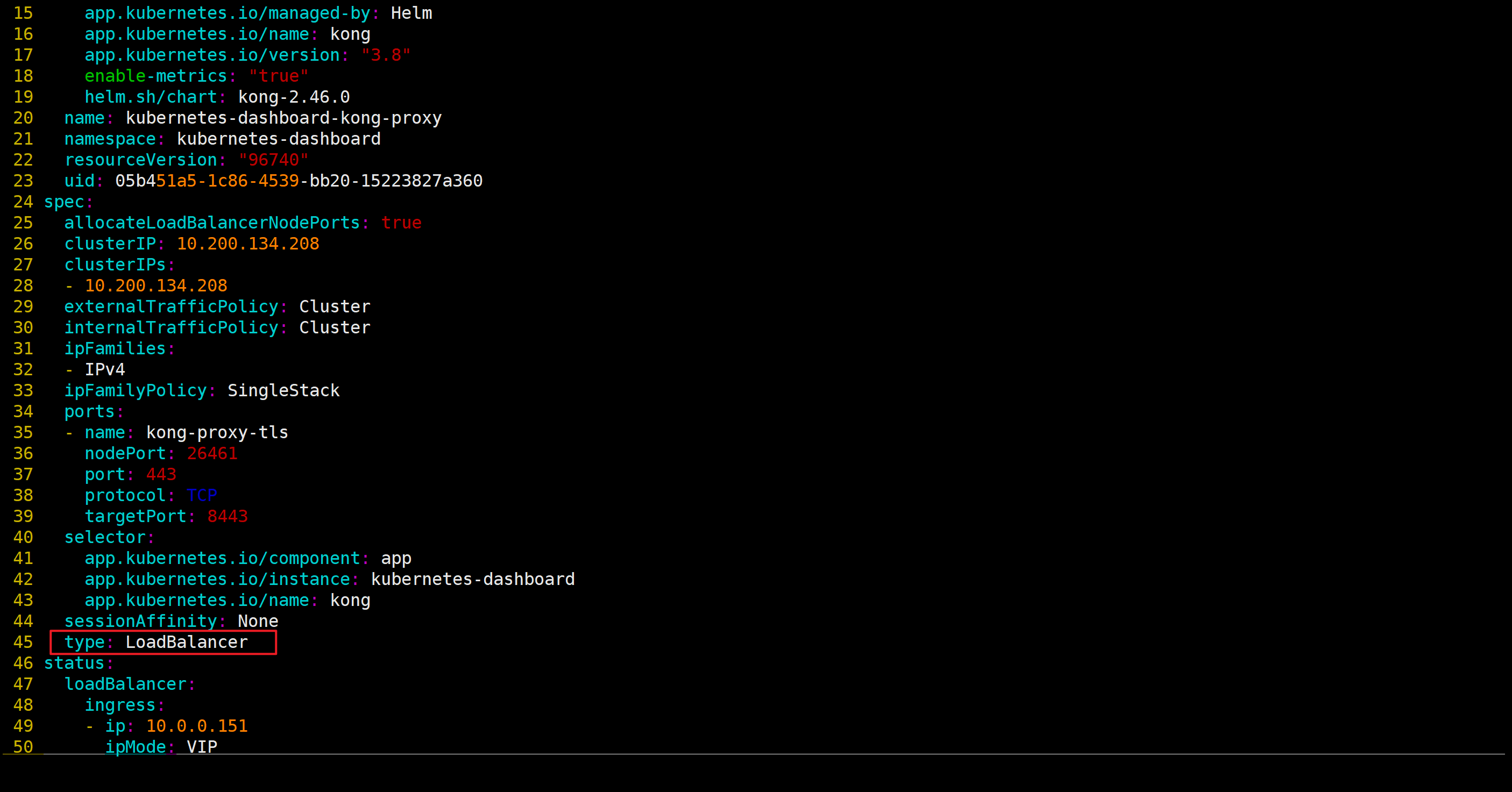 [root@k8s-cluster241 ~]# kubectl edit svc -n kubernetes-dashboard kubernetes-dashboard-kong-proxy
