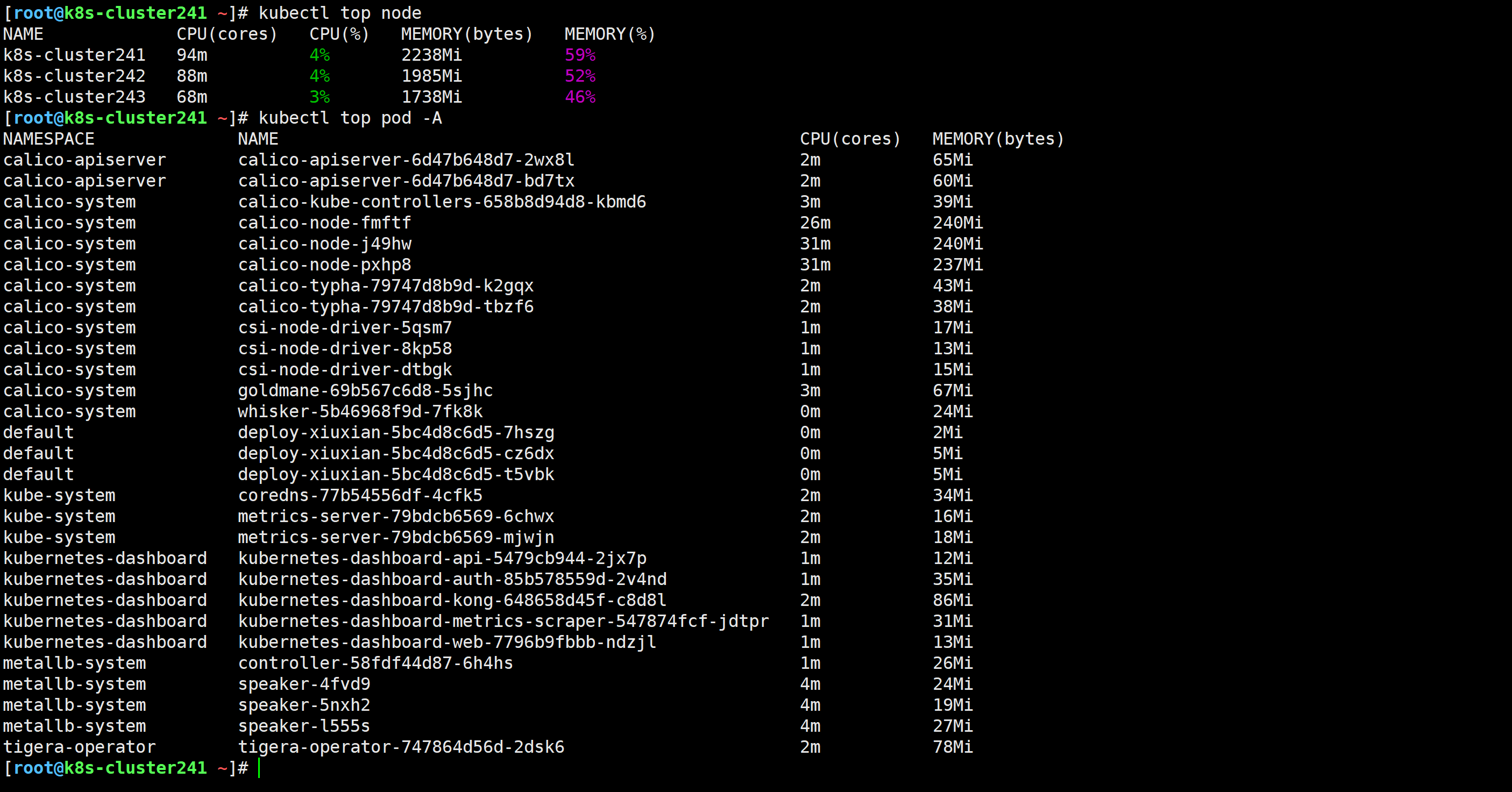 [root@k8s-cluster241 ~]# kubectl top pod -A