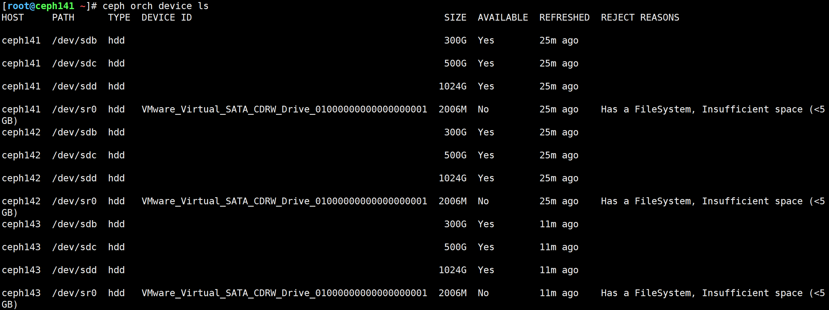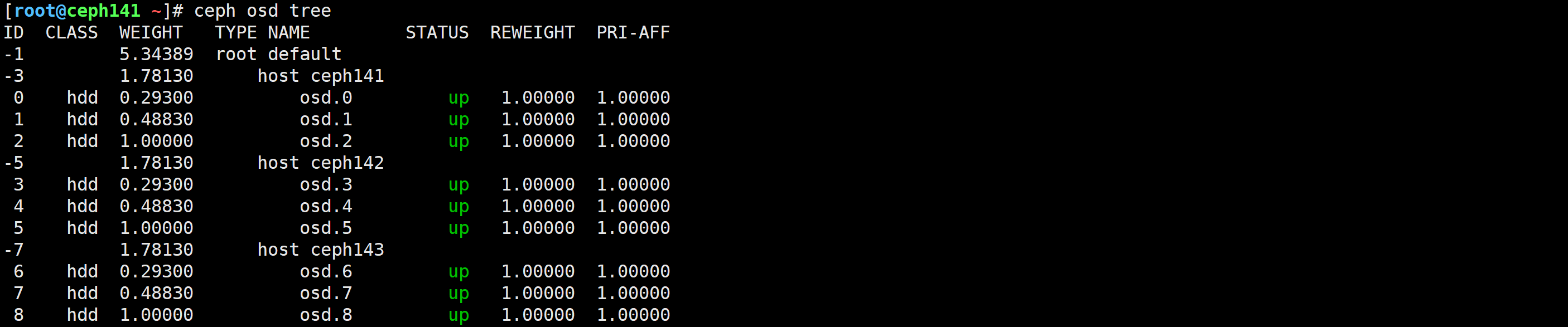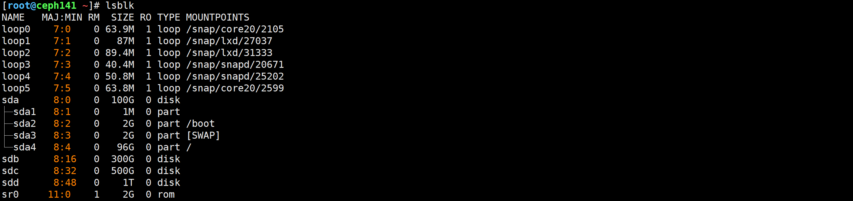 | ceph141 | 10.0.0.141 | CPU: 1c Memory: 2G /dev/sdb:300GB /dev/sdc: 500GB /dev/sdd: 1024GB |