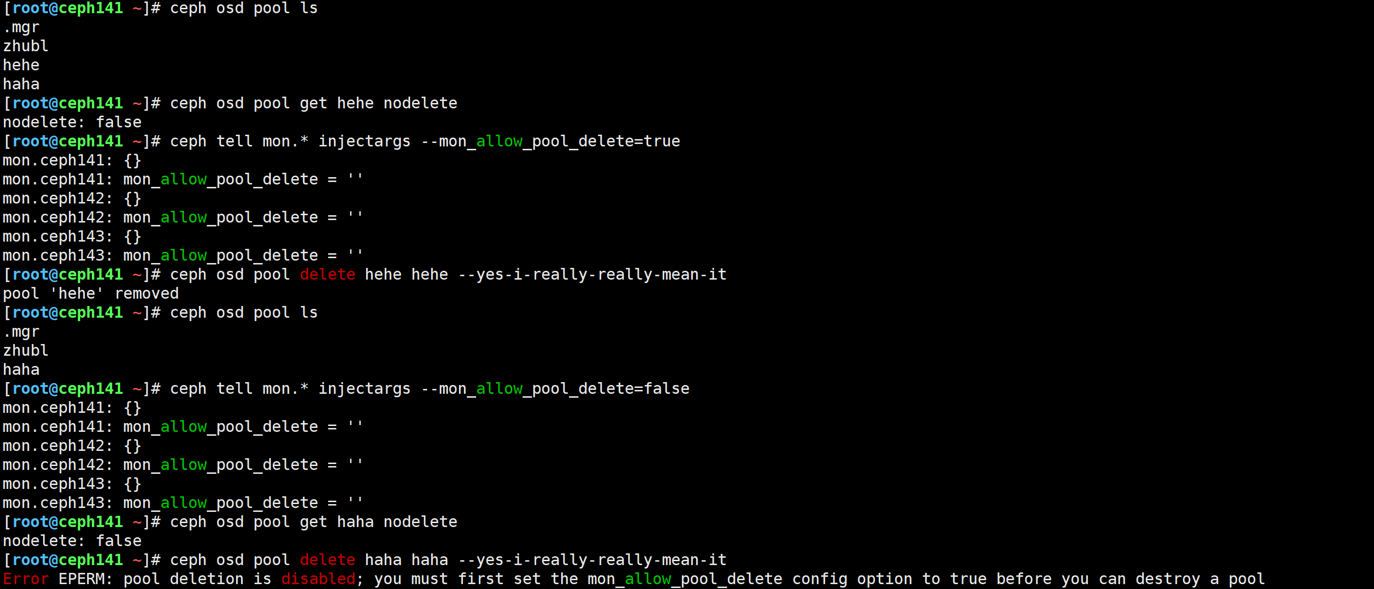 [root@ceph141 ~]# ceph tell mon.* injectargs --mon_allow_pool_delete=false