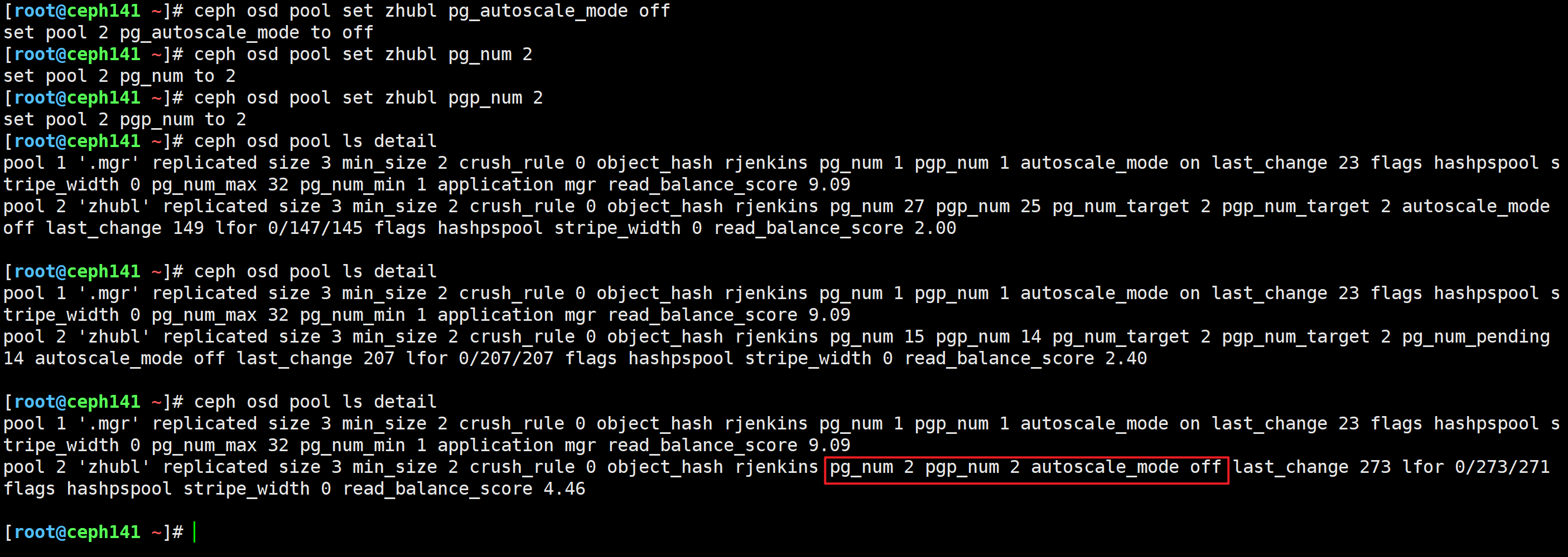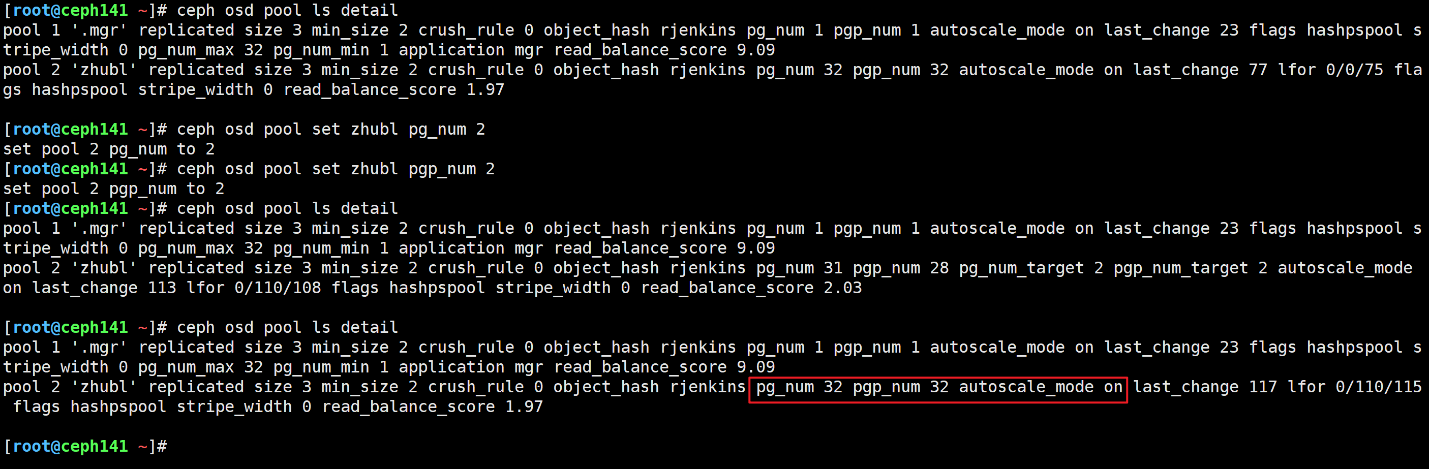 [root@ceph141 ~]# ceph osd pool set zhubl pg_num 2
