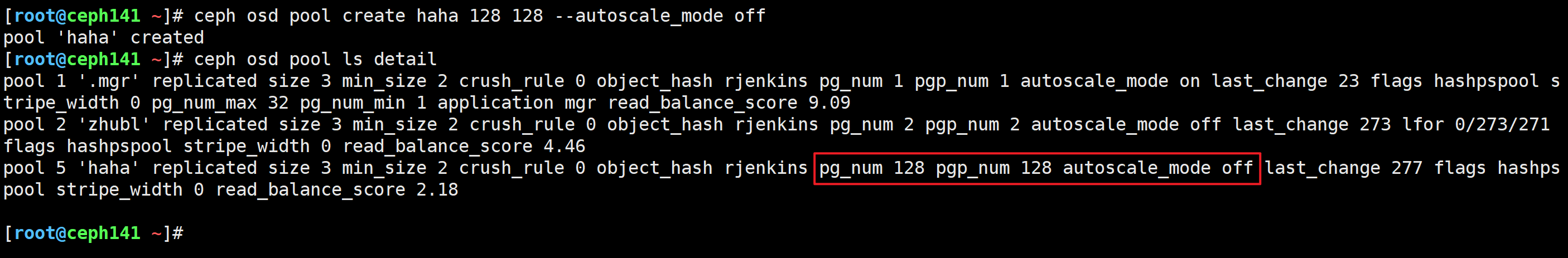 [root@ceph141 ~]# ceph osd pool create haha 128 128 --autoscale_mode off