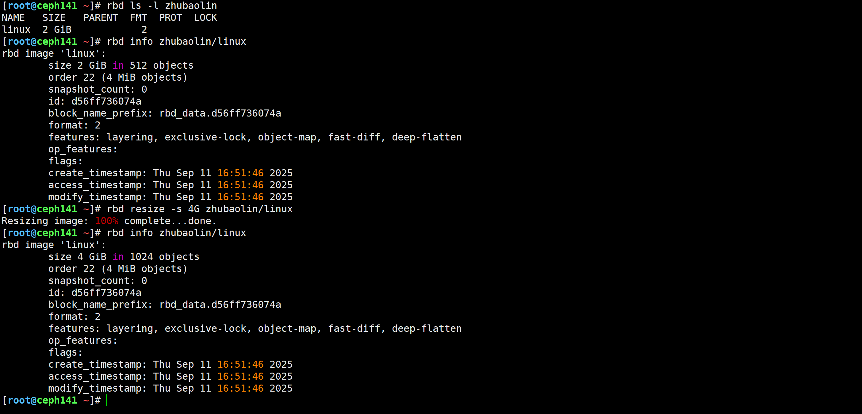[root@ceph141 ~]# rbd resize -s 4G zhubaolin/linux