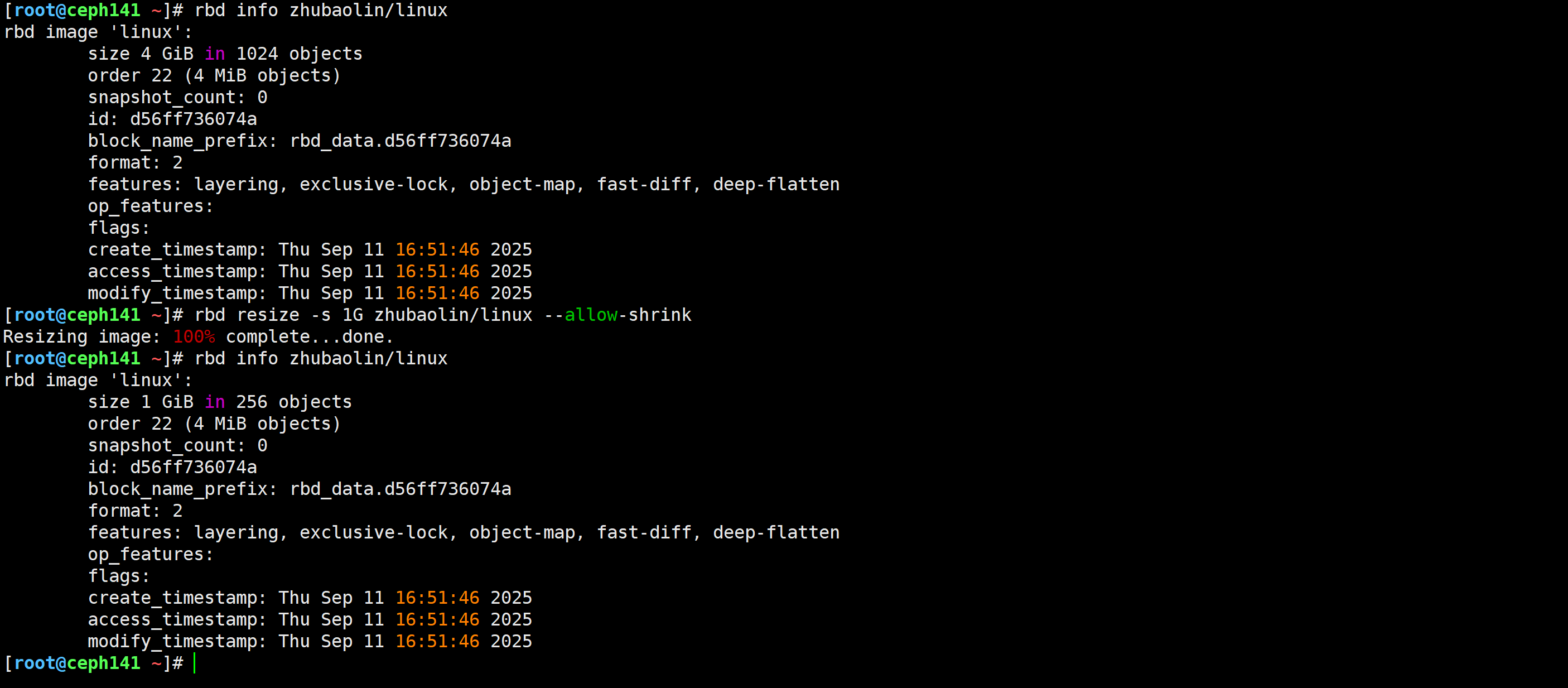 [root@ceph141 ~]# rbd resize -s 1G zhubaolin/linux --allow-shrink