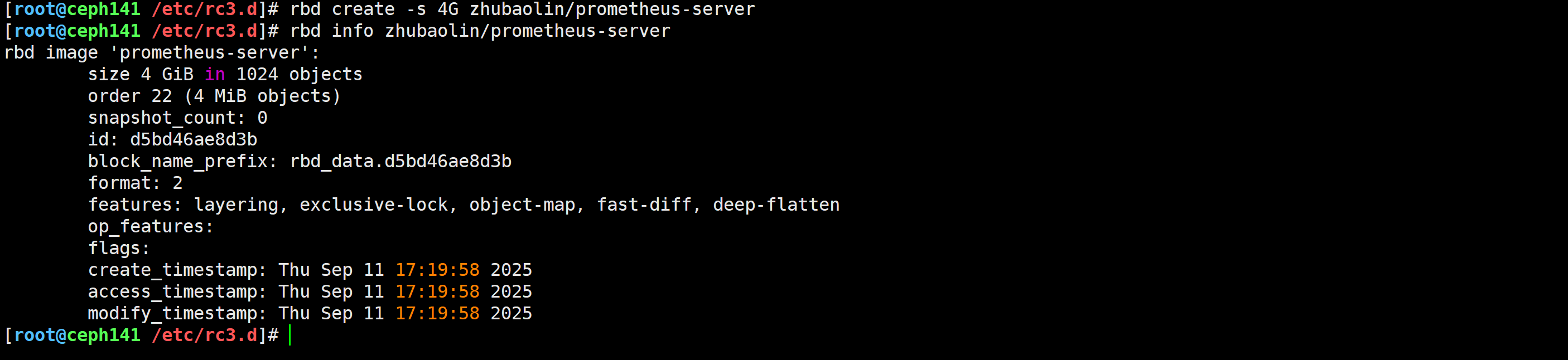 [root@ceph141 ~]# rbd create -s 4G zhubaolin/prometheus-server