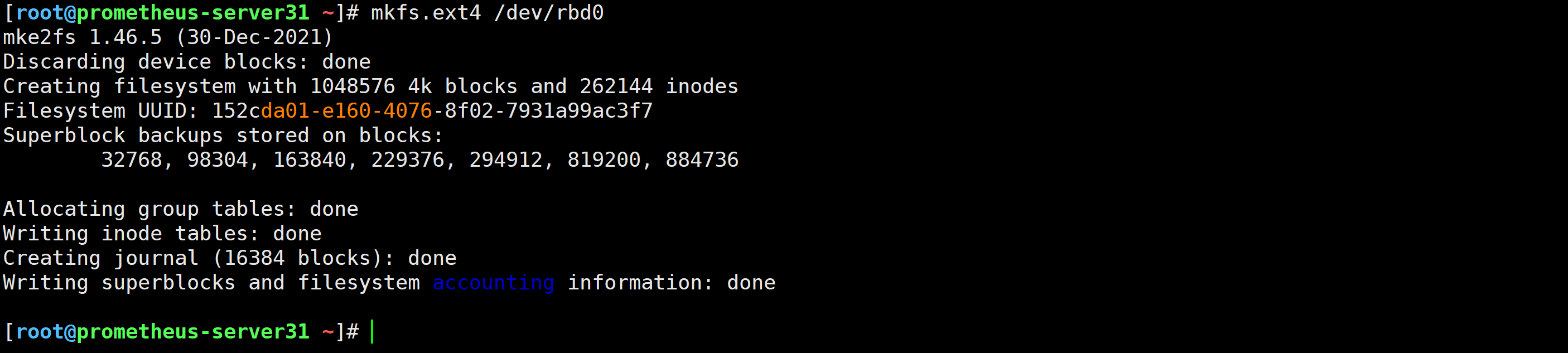 [root@prometheus-server31 ~]# mkfs.ext4 /dev/rbd0