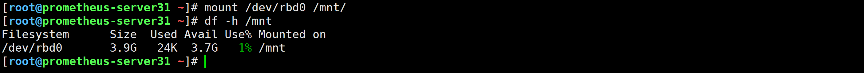 [root@prometheus-server31 ~]# mount /dev/rbd0 /mnt/