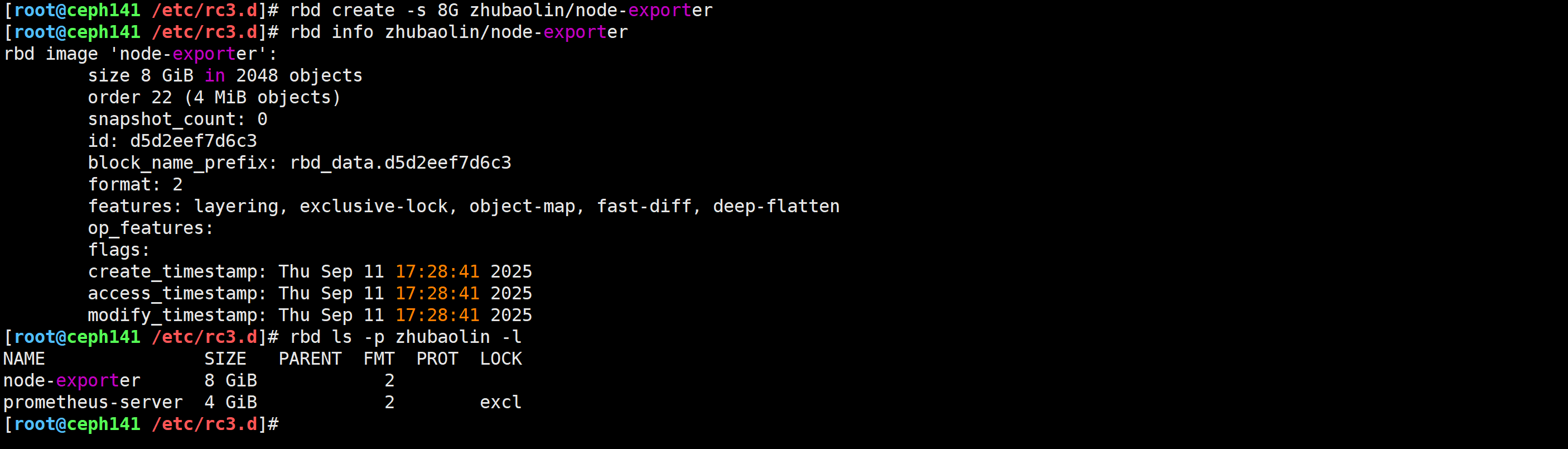 [root@ceph141 ~]# rbd create -s 8G zhubaolin/node-exporter