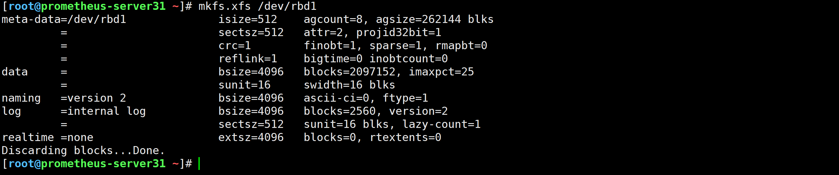 [root@prometheus-server31 ~]# mkfs.xfs /dev/rbd1