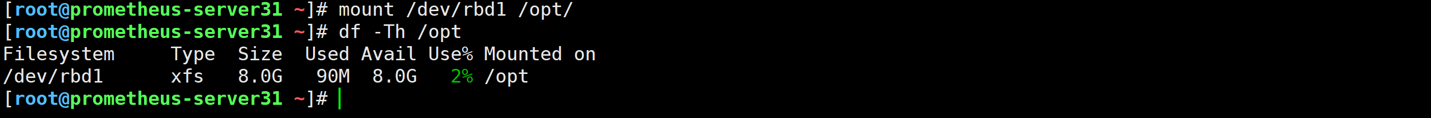 [root@prometheus-server31 ~]# mount /dev/rbd1 /opt/