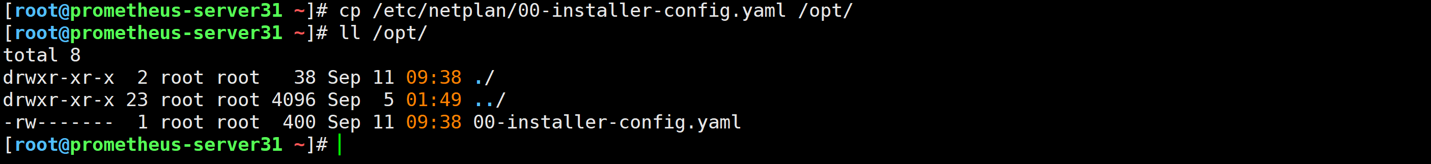 [root@prometheus-server31 ~]# cp /etc/netplan/00-installer-config.yaml /opt/