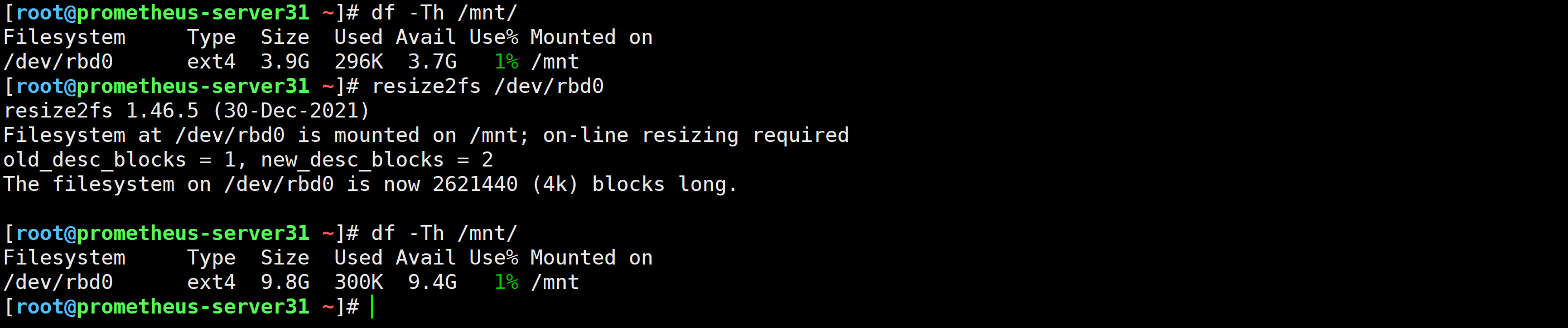 [root@prometheus-server31 ~]# resize2fs /dev/rbd0