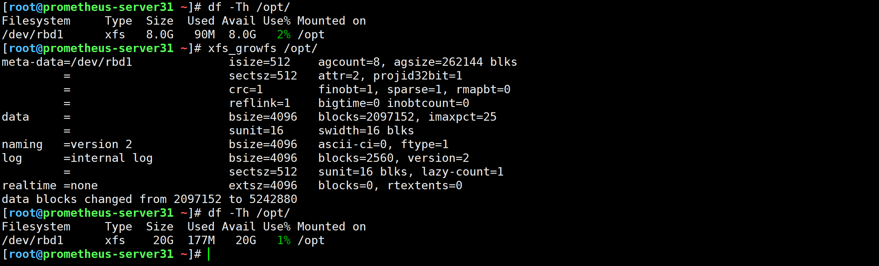 [root@prometheus-server31 ~]# xfs_growfs /opt/