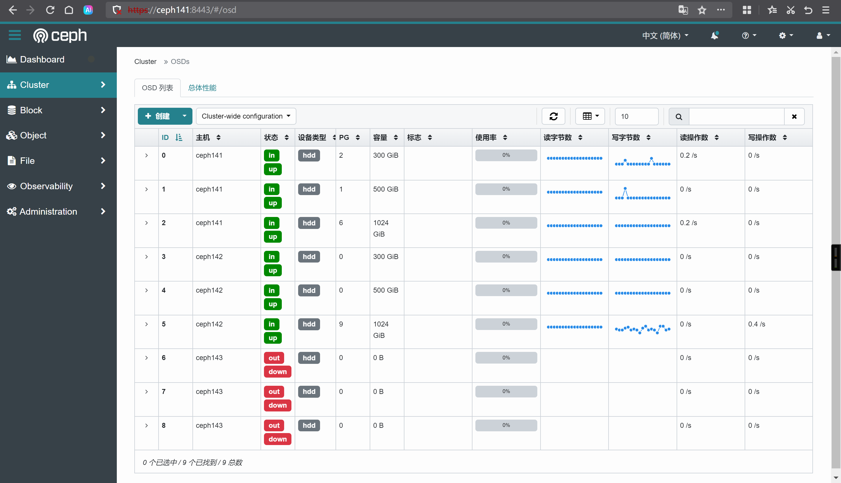 | ceph143 | 10.0.0.143 | CPU: 1c Memory: 2G /dev/sdb:300GB /dev/sdc: 500GB /dev/sdd: 1024GB |