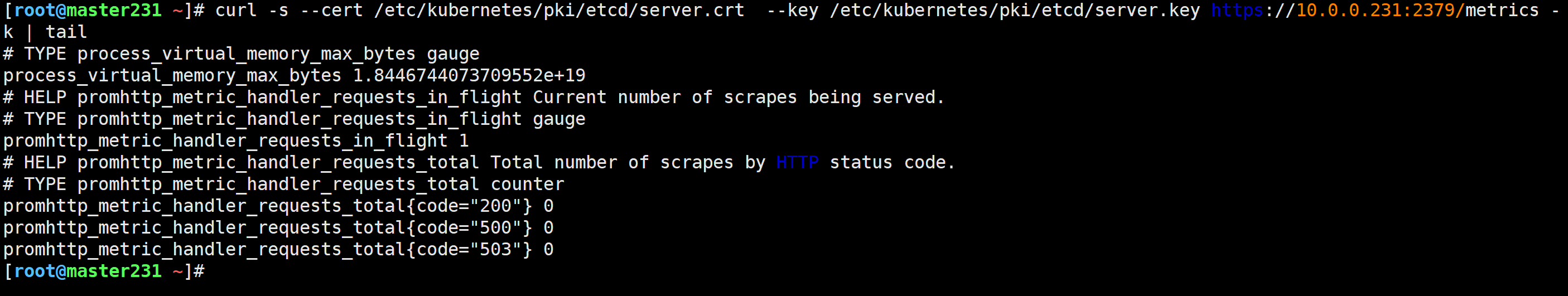 [root@master231 ~]# curl -s --cert /etc/kubernetes/pki/etcd/server.crt --key /etc/kubernetes/pki/etcd/server.key https://10.0.0.231:2379/metrics -k | tail